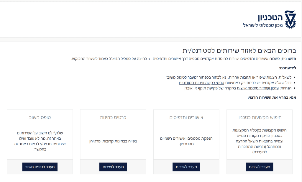 אם נתקלת בבעיה בזמן הכניסה לאזור האישי של הטכניון, עליך לפנות למחלקת טכנולוגיות מידע של הטכניון כדי לקבל סיוע וסיוע טכני.